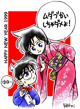 「こなん通信社」表紙イラスト。1999年1月掲載。 なにぶんにもお正月。いろいろ、やりようはあった訳だけど。 やっぱり、蘭ちゃんの着物姿が描きたかったわけです。 もちょっと、柄に凝りたかったんだけど… ま、それは。コナンくんの着物とともに、来年への課題ですね。 …来年のことより、目下の更新をちゃんとやれって感じですか? (谷 豊/1999.1)