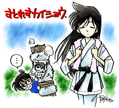 「こなん通信社」表紙イラスト。1999年10〜12月掲載。テーマは「スポーツの秋」? 蘭ちゃんパワーをもってすれば、丸太もへし折ってしまいそう… とは思いつつ。 あまりに新一くん、不憫な感じがしたので。 (谷 豊/1999.10)
