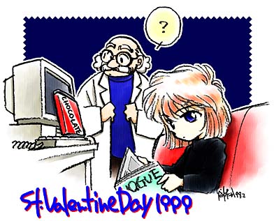「こなん通信社」表紙イラスト。1999年2月掲載。 テーマ「バレンタイン」でこのツーショットは、なかなか思いつかないでしょう…という、自己満足の一品。 構図、遠近には、反省の材料あり。 (谷 豊/1999.2)