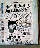 「少年サッカーチーム・部員募集中!」 コナンくんというと、どうしても「探偵」というイメージですから。こんなふうにサッカーをするコナンくんを目にしますと、たいへん新鮮な気分です。 というわけで。東京は足立区、「旭フットボールクラブ」というところの部員募集ポスターに登場の、サッカー少年・コナンくん。クラブの世話役の方が描いたのでしょうか? オリジナルのユニフォームでボールを蹴るコナンくんのイラスト、とっても可愛いですね。 (UpLoad 98.3.18)