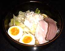 メンをゆでて、スープに入れ、 野菜炒め、カニ、ハム、ゆで卵をのせて、 できあがり。